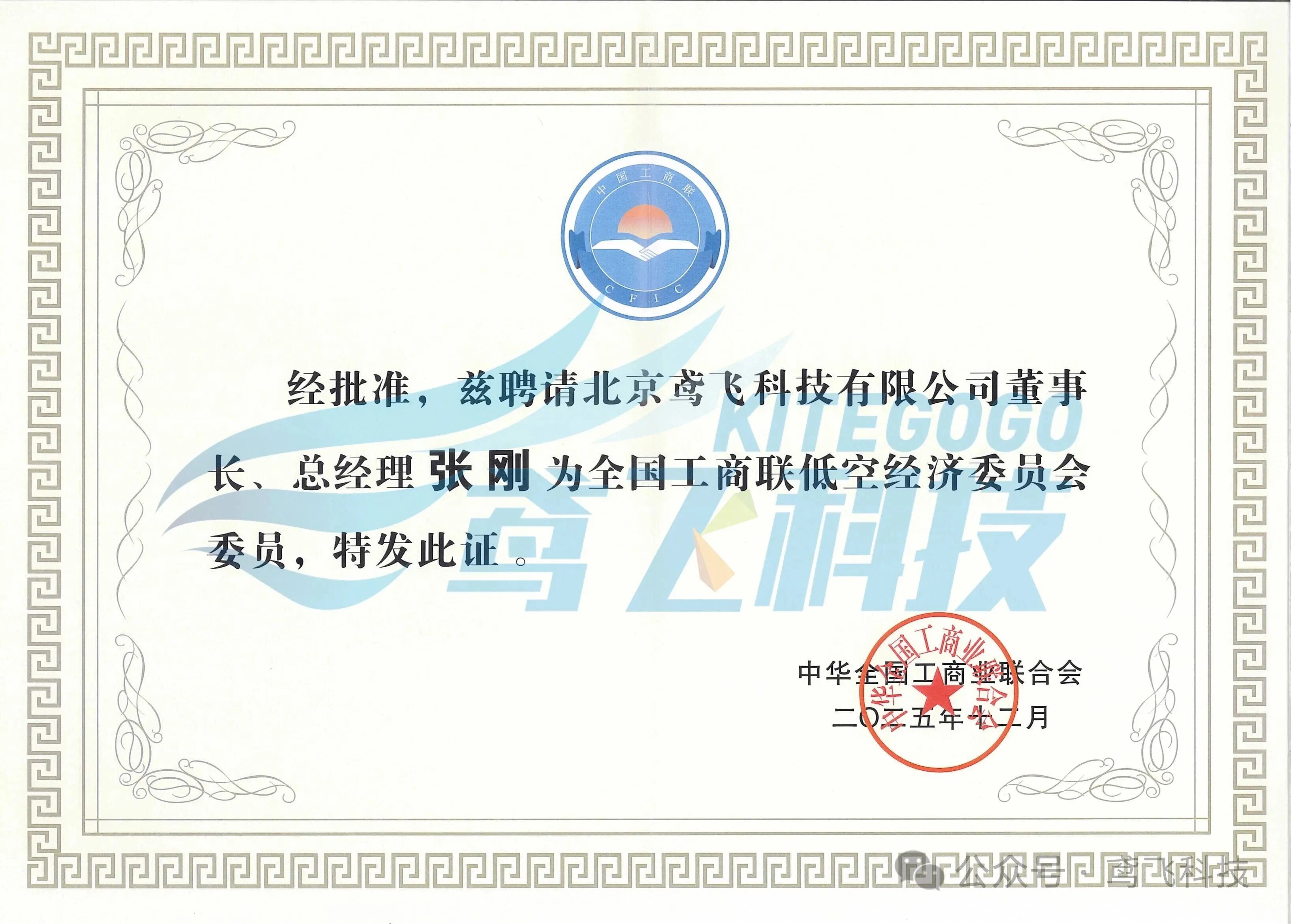 参股企业动态 | 鸢飞科技董事长张刚被约请为天下工商联低空经济委员会委员
